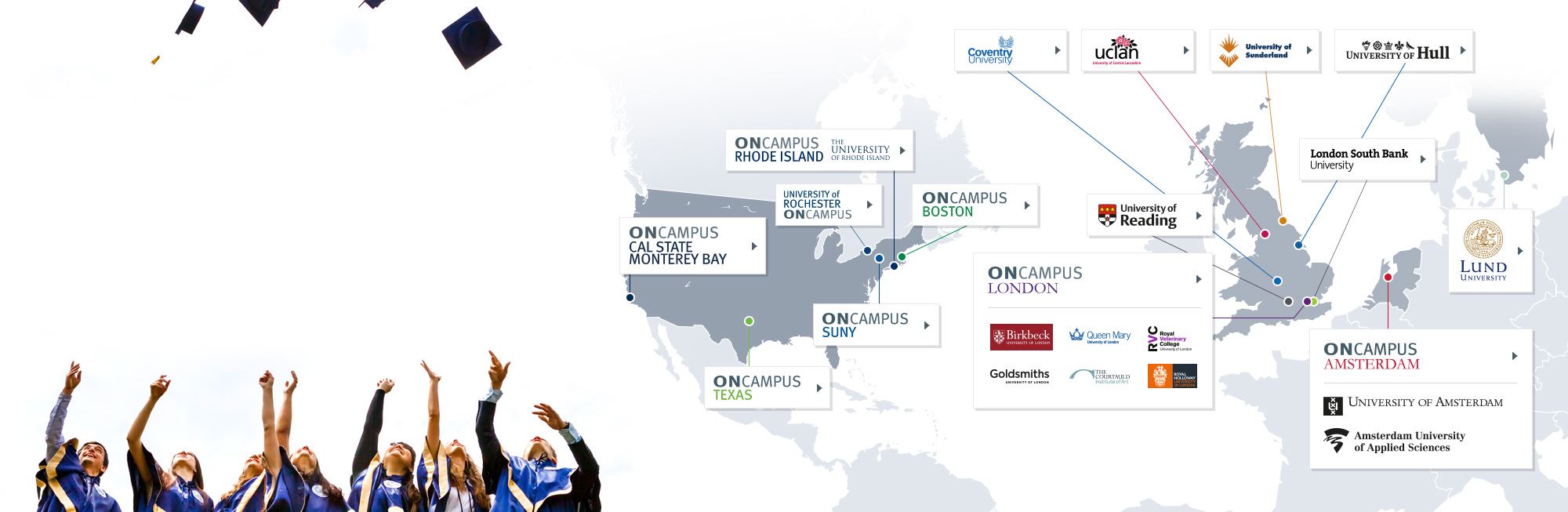 Центры ONCAMPUS располагаются при кампусах университетов Великобритании, США и Европы.